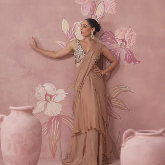 Diva is built around a statement hand-embroidered blouse, studded with stones, pearls and mirrors in a jewel-like arrangement that reads almost like bespoke jewellery on skin. The draped saree in a soft nude-rose tone falls in fluid layers, creating movement and softness without volume. The contrast between the sculpted, handworked blouse and the gentle, liquid fall of the drape gives the piece its presence — refined, impactful, and made for moments that call for quiet glamour.