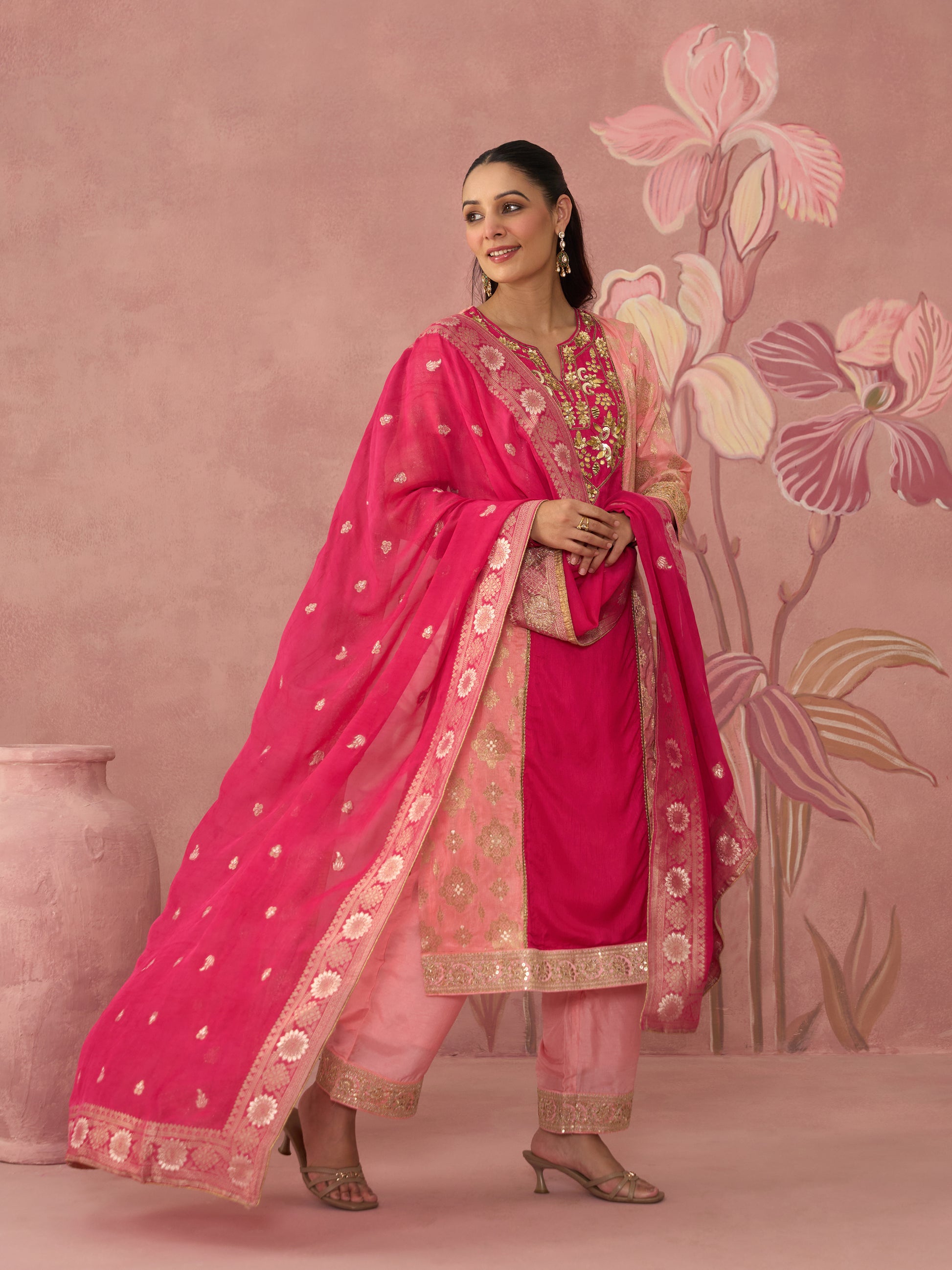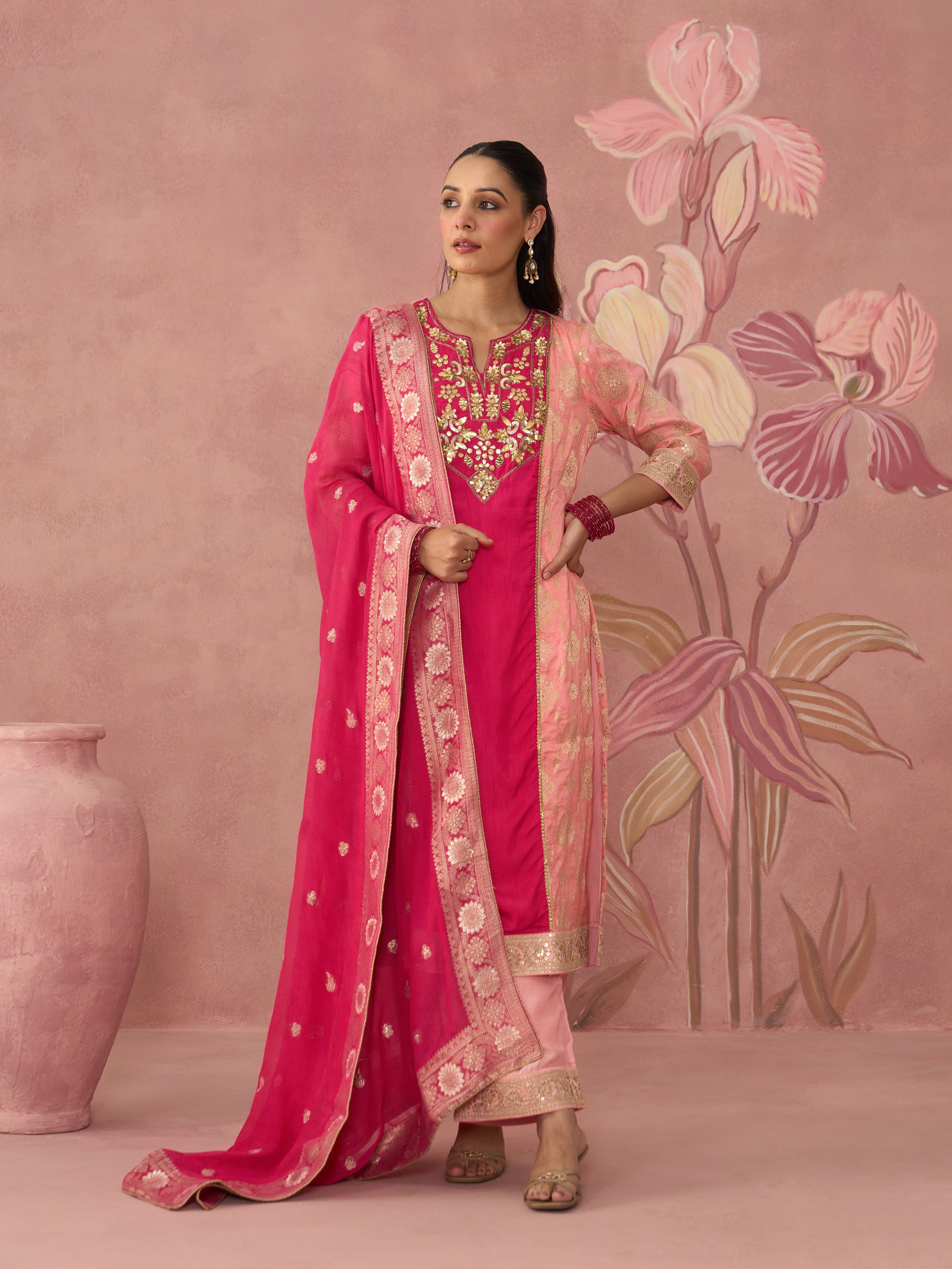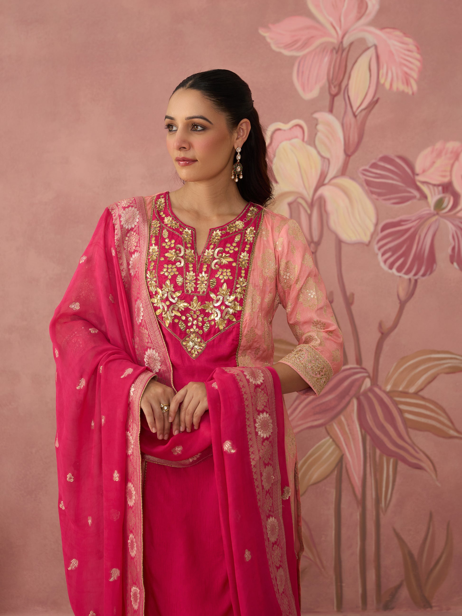Ela comes in a festive bright pink, rooted in a rich hand-embroidered yoke that brings structure and detail to the set. The dupatta is equally considered, finished with zari motifs and a beautifully framed border that adds polish and presence. Comfortable to wear yet visually striking, Ela is designed for celebrations where colour, craftsmanship and ease come together with intention.