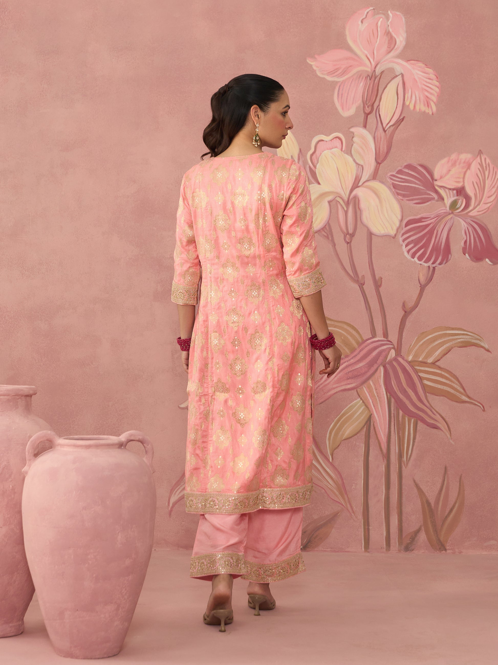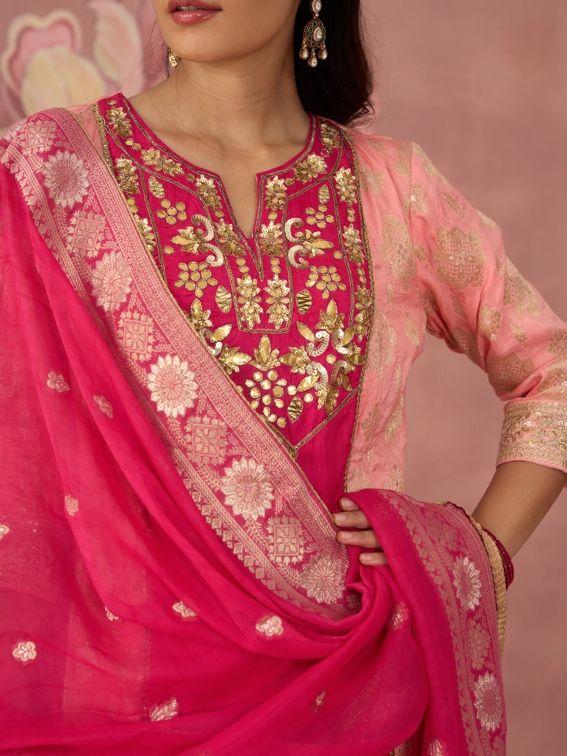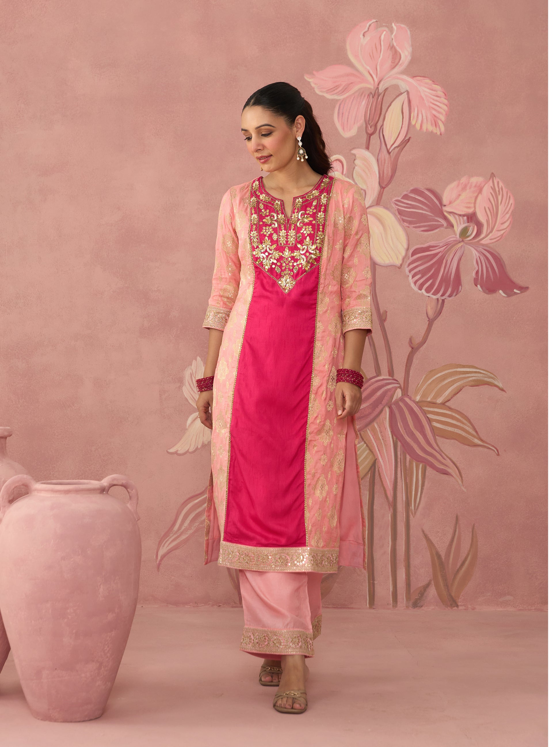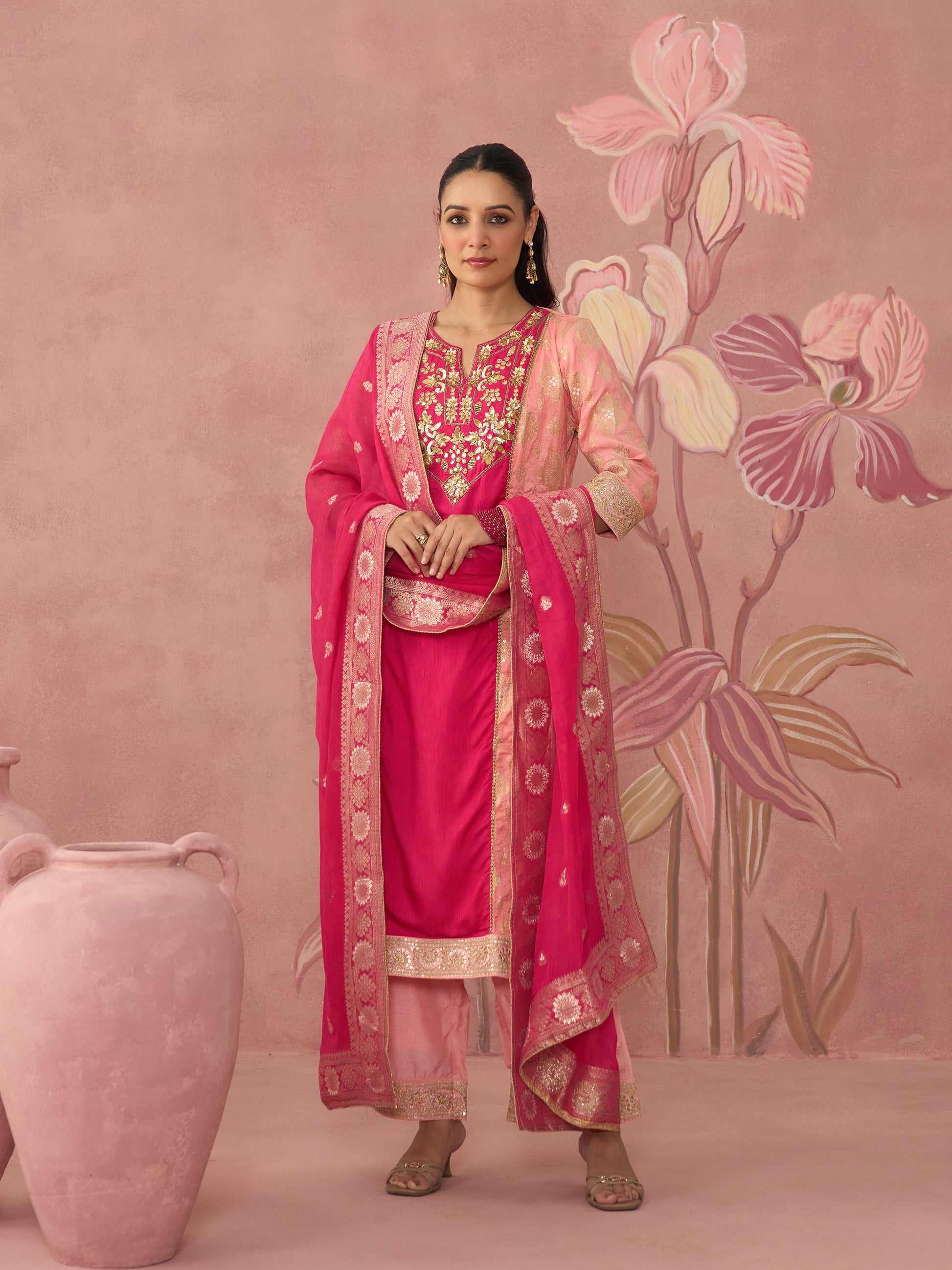 Ela comes in a festive bright pink, rooted in a rich hand-embroidered yoke that brings structure and detail to the set. The dupatta is equally considered, finished with zari motifs and a beautifully framed border that adds polish and presence. Comfortable to wear yet visually striking, Ela is designed for celebrations where colour, craftsmanship and ease come together with intention.
