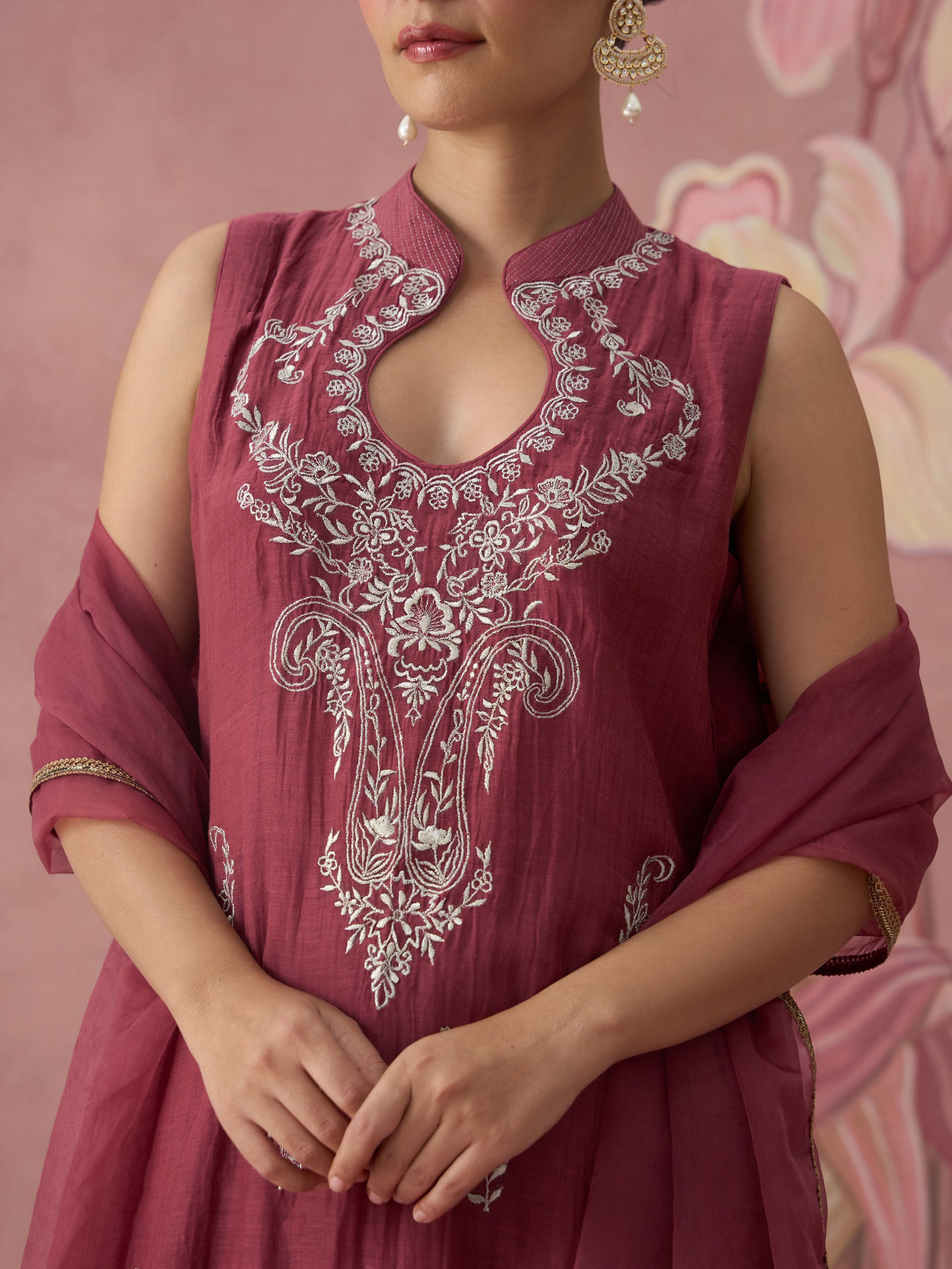 Heer features a deep rose–wine hue brought to life with intricate silver thread and sequin embroidery. The neckline is sculpted into a keyhole curve, framed with ornate handwork that continues in a symmetrical pattern across the front — detailed yet refined. Scattered bootis lend soft shimmer to the kurta without overwhelming the silhouette.