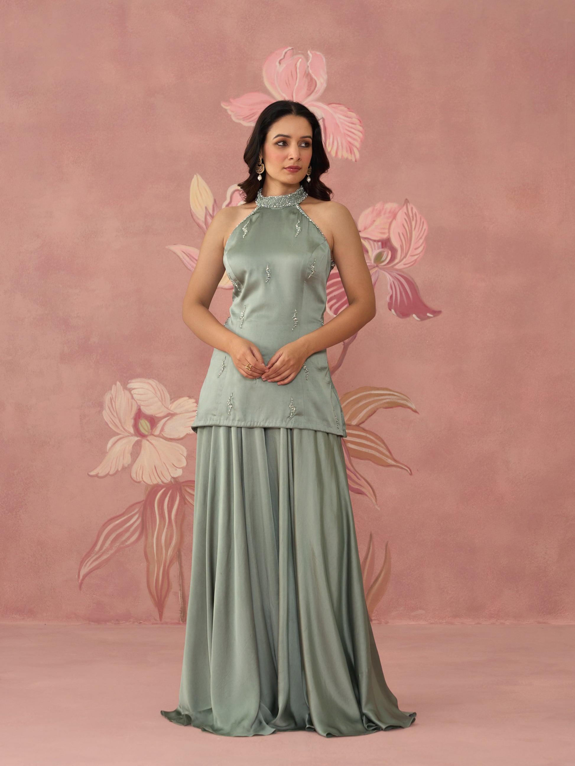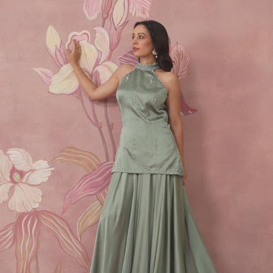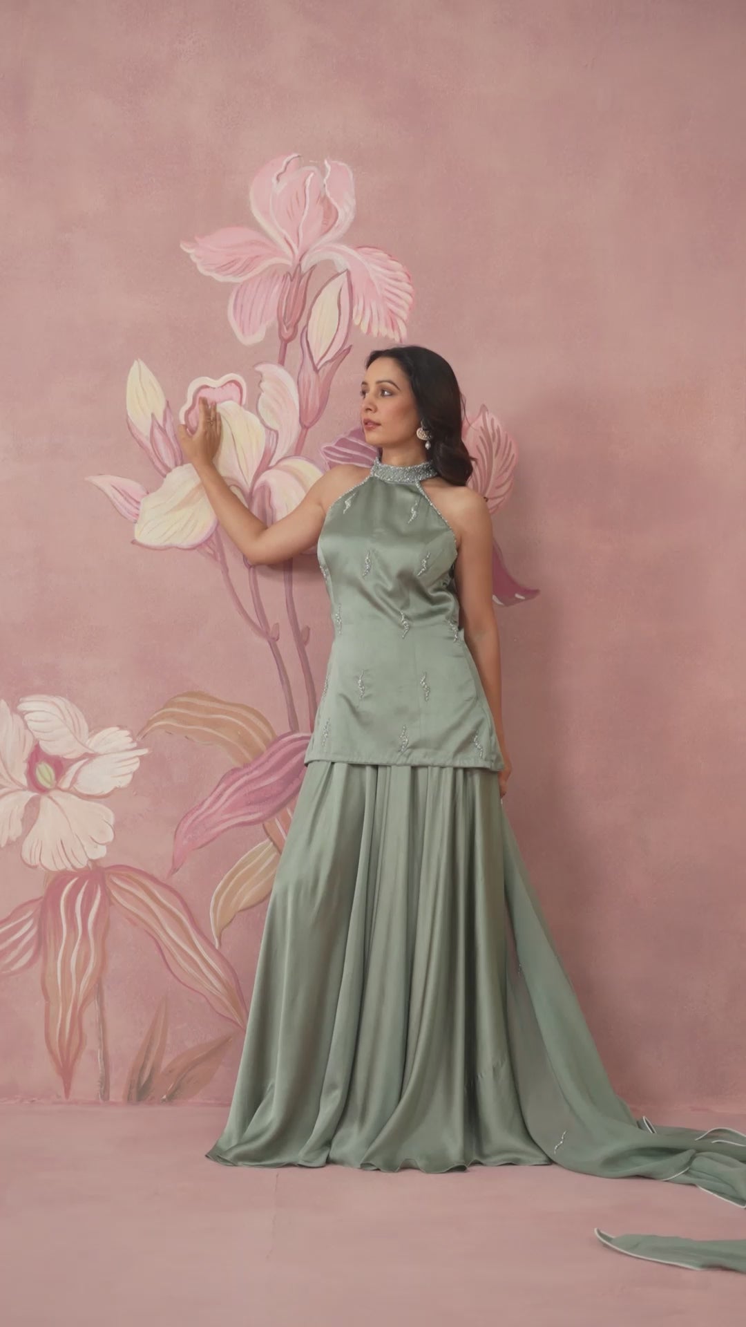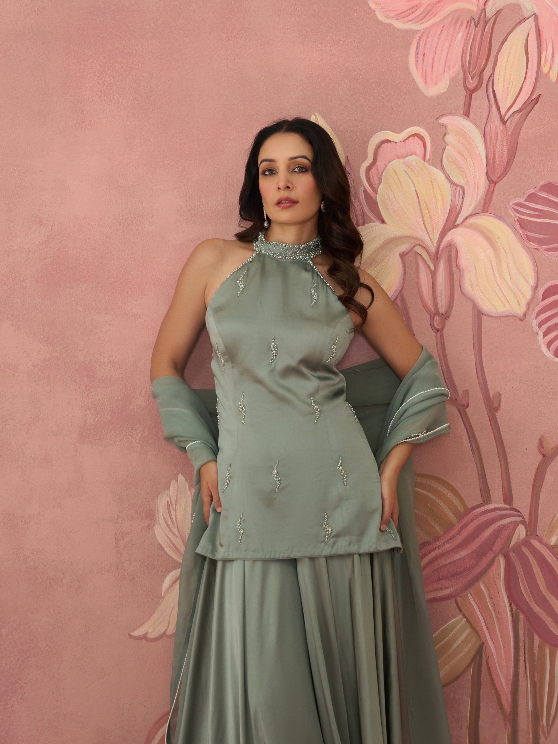 A muted blue with a cool silver undertone forms the base of this set, cut in a halter silhouette that draws attention to the intricately embroidered neckline. Fine handwork trails across the front of the kurta, creating a soft all-over shimmer that reads refined rather than ornate. Paired with a full-flare sharara that moves with ease and a hand-embroidered dupatta finished with pearl trims, Inaara brings occasion polish in a quietly understated way.