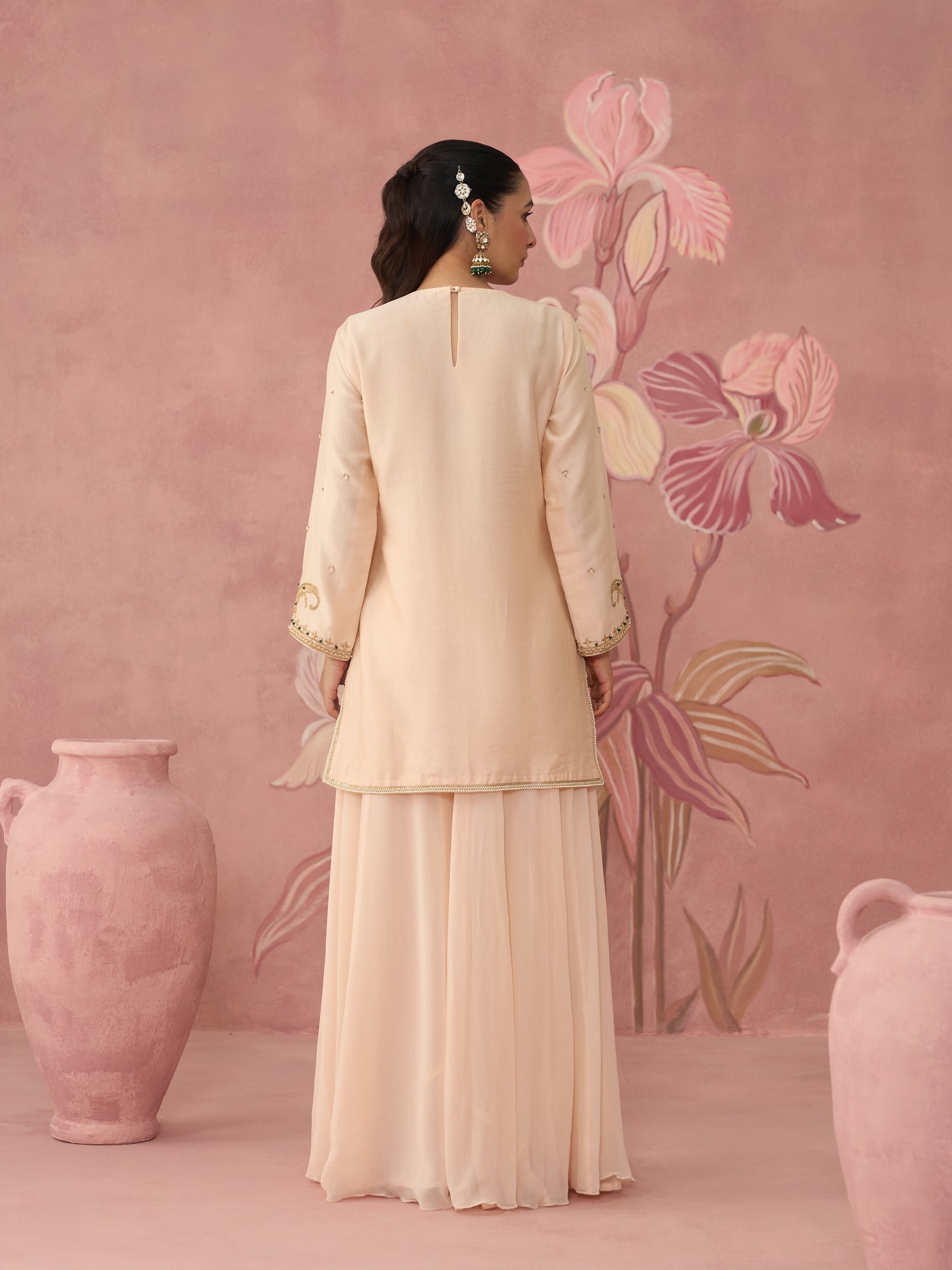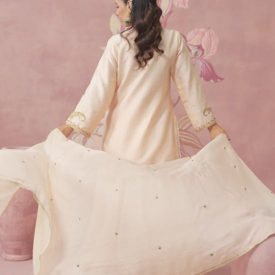 Mahira is crafted in a soft, blush-pink tone and detailed with intricate hand embroidery across the kurta, featuring our signature chaand-bala motif as the focal element. The 3D boota is finished with delicate dangling accents, giving the embroidery dimension and movement. Contrast green detailing adds depth and definition against the pastel base, enriching the artwork without overwhelming it. Paired with a flowy sharara and a dupatta finished with scattered motifs, Mahira carries a quiet, old-world charm with a refined, contemporary ease.
