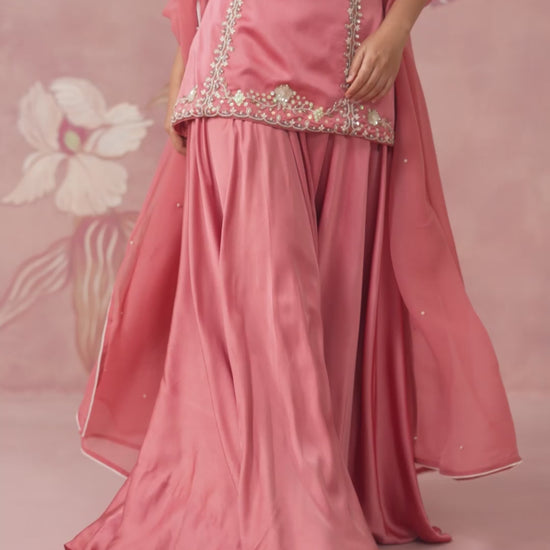 Saira is cut in a soft rose hue, framed with intricate hand embroidery that traces the neckline and follows the length of the kurta for a clean, elongating line. The hem is finished with delicate floral work, adding definition without excess. Paired with a full-flare sharara and a hand-embroidered dupatta trimmed with pearls, it brings a feminine, occasion-ready mood that still feels light to wear.